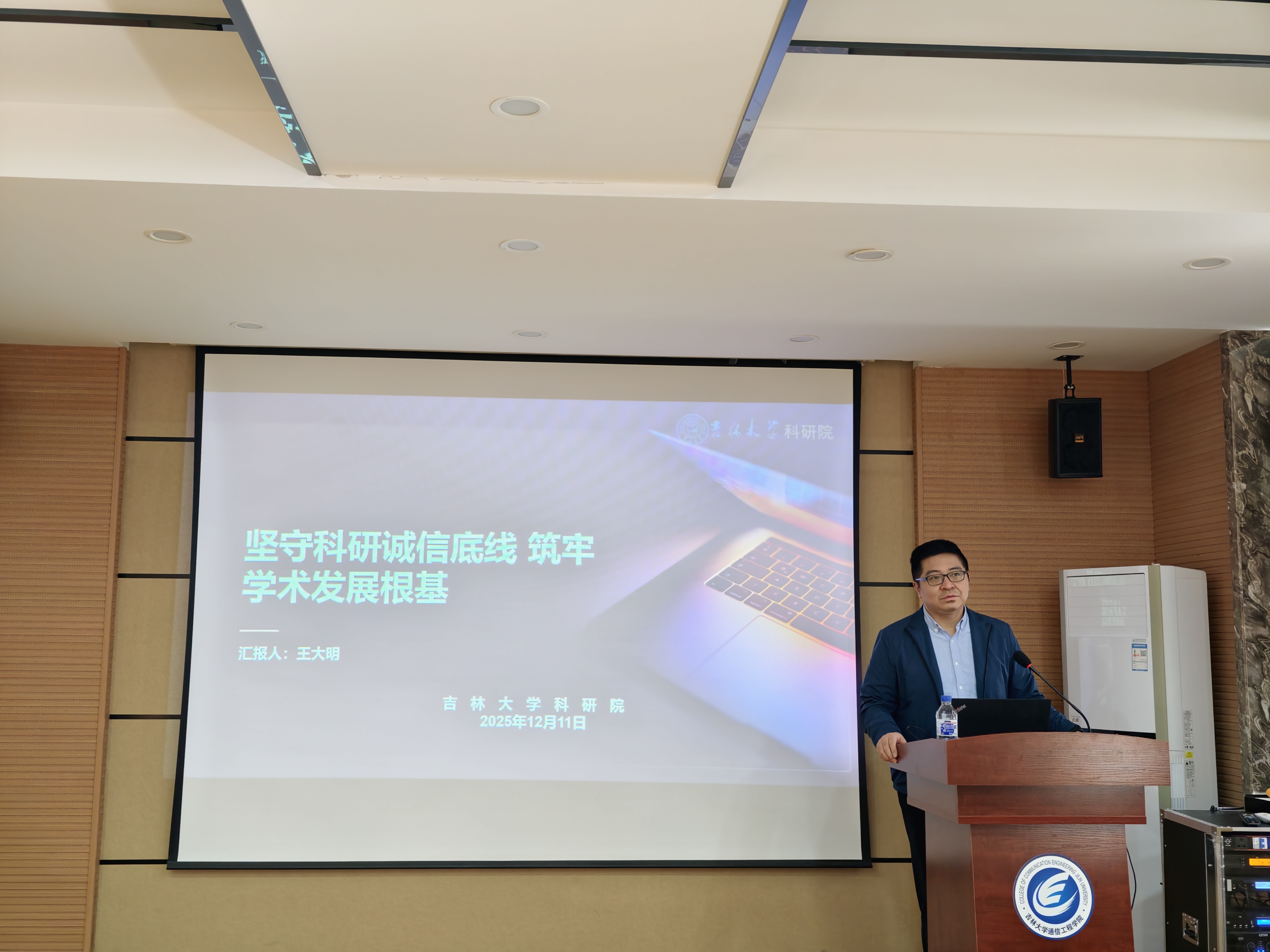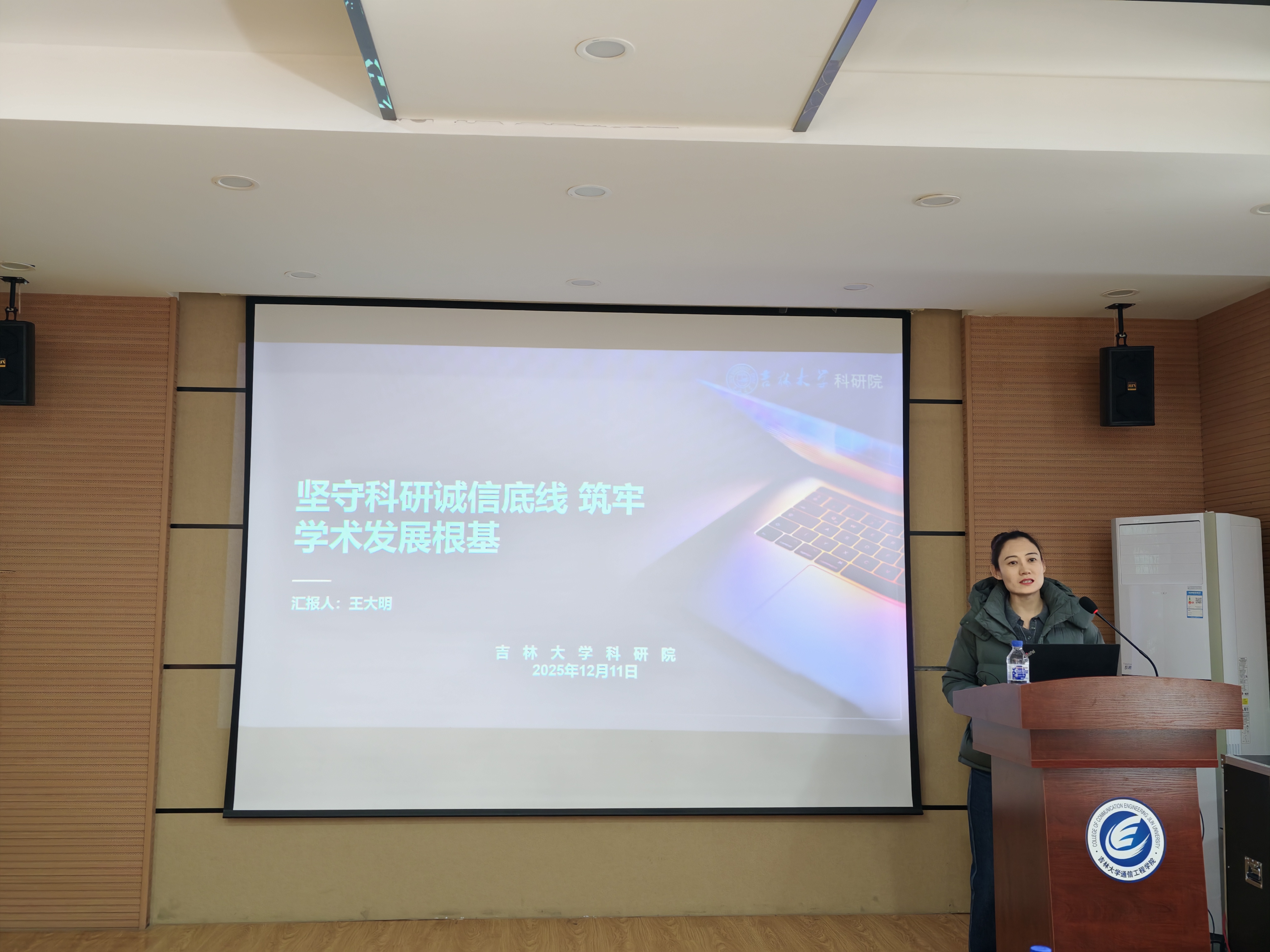 为深入贯彻国家科研诚信建设相关政策要求,强化全院师生学术道德意识,规范科研行为,营造风清气正的学术生态,12 月 12日,通信工程学院组织开展科研诚信专题宣讲会。本次活动特邀吉林大学科研院王大明主任主讲,以“坚守科研诚信底线 筑牢学术发展根基”为主题,为学院师生带来一场兼具理论深度与实践指导意义的专题分享。宣讲会由通信工程学院副院长王雪主持,学院科研团队师生代表参加本次宣讲会。